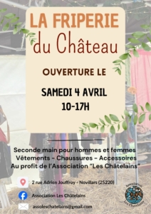 Friperie au Foyer de Vie le Château à Novillars Les résidents du Foyer de Vie le Château à Novillars ont le plaisir de vous inviter à leur prochaine friperie, qui se tiendra le samedi 08 novembre 2025 de 10h à 17h, à l'adresse suivante : 2 rue Adrien Jouffroy, 25220...