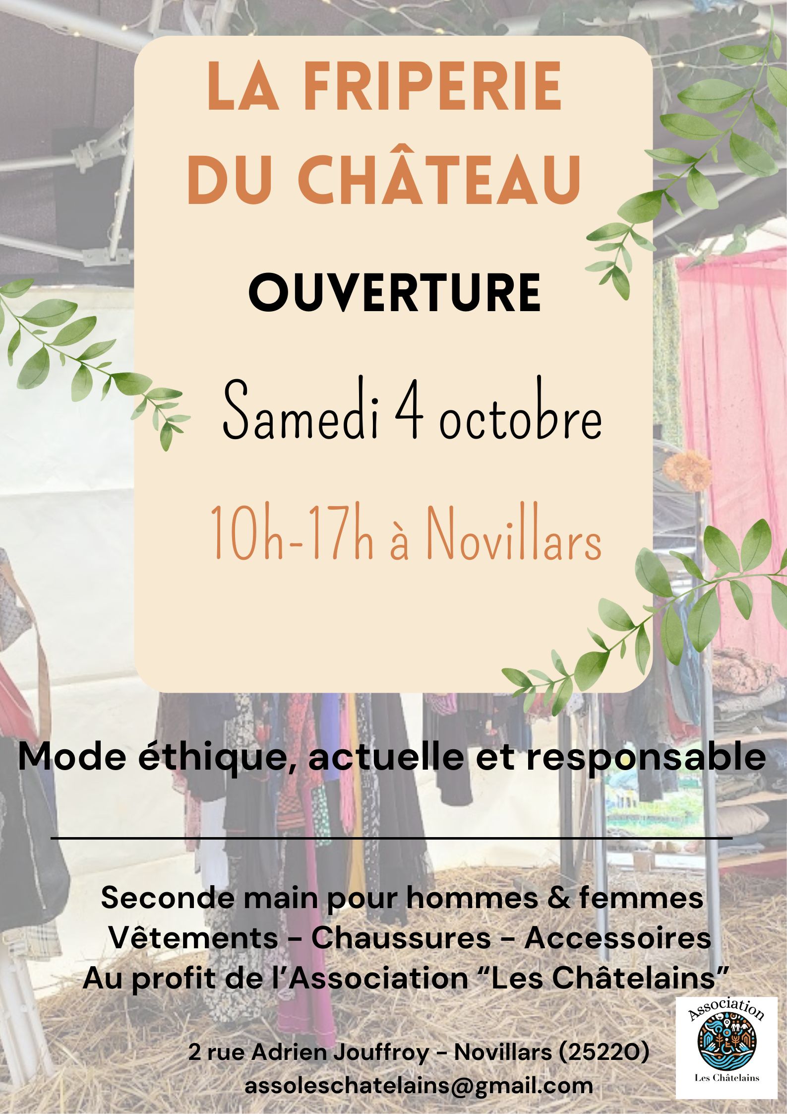 Les résidents du Foyer de Vie le Château à Novillars ont le plaisir de vous inviter à leur prochaine friperie, qui se tiendra le samedi 04 octobre 2025 de 10h à 17h, à l’adresse suivante : 2 rue Adrien Jouffroy, 25220 Novillars.